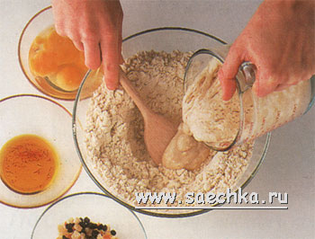 - Всыпьте оставшийся сахар, сделайте углубление в середине, влейте опару, ром с шафраном и добавьте оставшиеся ингредиенты.