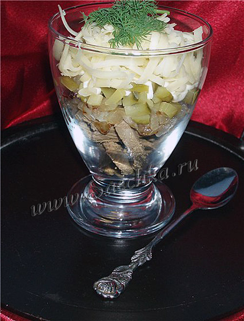 Вкусный слоёный салат с говяжьей печенью и солёным огурцом - особенно хорош, когда настоится.