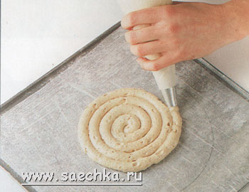 - Взбейте яичные белки в крепкую пену и постепенно по 1 ст.л. добавьте половину порции сахара. Продолжайте взбивать, пока смесь не станет густой и глянцевитой. Осторожно влейте 1 ст.л. кофейной эссенции и всыпьте орехи, размешайте и переложите в корнетик с простой насадкой. Начиная от центра, выдавите смесь концентрическими кругами на подготовленный пергамент.