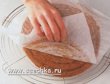 - Положите остывший бисквит на поворотный круг и разрежьте на три одинаковых коржа. Подровняйте по ним коржи из белкового теста. Составьте торт следующим образом: бисквитный корж, немного глазури, корж из белкового теста и т.д. Последний бисквитный корж должен оказаться наверху.