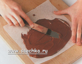 - Растопите 50 г (1/3 чашки) фишек или кусочков черного шоколада и разлейте по кулинарному пергаменту очень тонким слоем. Оставьте для остывания.