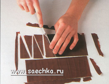 - Аккуратно отделите бумагу от застывшего шоколада и нарежьте 12 равнобедренных треугольников с длинной стороной 10 см и короткой - 2,5 см.