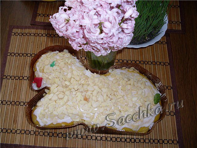 Барашек выпечен из этого теста, обмазала покупной белковой глазурью, посыпала миндалем и сделала ротик из мастичного сердечка, хвостик - из мастичного листика, глазки – посыпка.