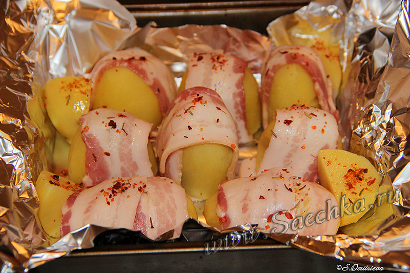 - Завернуть каждую половинку картофеля в ленточку сырокопчёной грудинки и в кусочек фольги (или целиком обернуть фольгой).