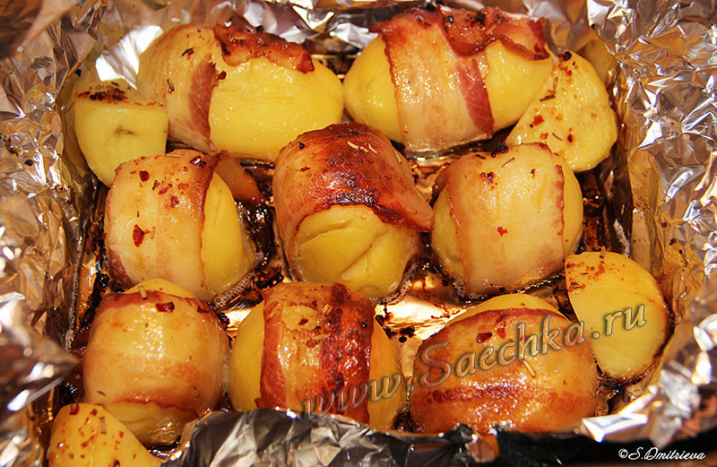 - В конце приготовления приоткрыть фольгу и дать картофелю в беконе зарумяниться.