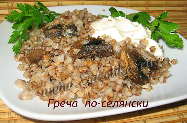 - Готовую гречку по-селянски перемешать, подавать со сметаной.