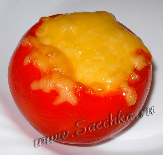 - Фаршируем ею помидоры, посыпаем тёртым сыром.