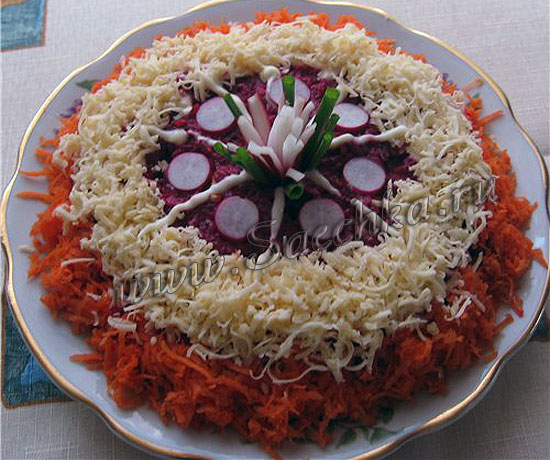 - Сверху салат украшаем (я оставила немного моркови и сыра, добавила лучок и редиску для украшения).