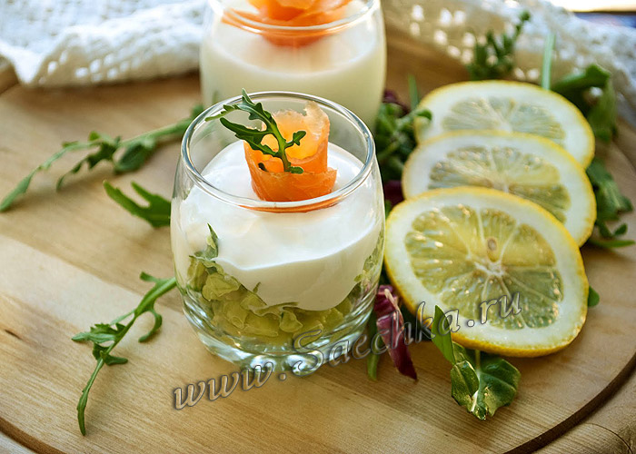 - Выложите на дно стаканчика сначала овощи, потом йогурт, в центр – рулетик рыбы.