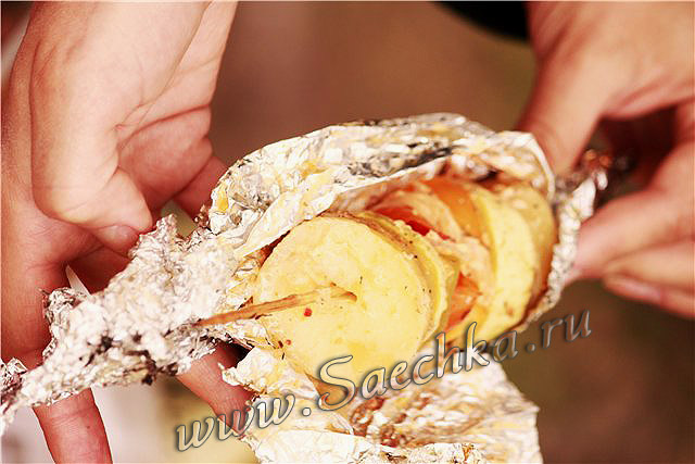 - Кладем овощи на фольгу, солим и перчим, поливаем соусом, укутываем и кладем в угли.