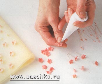 - Изготовьте плунжерной формой 40 небольших простых цветов, соедините их с пестиками проволочкой и клейкой лентой. Оставьте все цветы на ночь в коробках в сухом теплом месте. Кусочком свежей лепестковой помадки скрепите 30 цветов в букетик, которым украсите торт сверху.