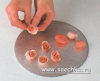 - Разделите лепестковую помадку на 3 порции. Желтым и розовым красителями окрасьте первую в бледный, вторую - в более яркий, а третью - в темный коралловый цвет. Изготовьте 5 роз с темными внутренними лепестками и светлыми внешними.