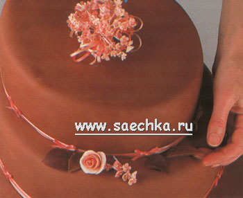 - Накануне свадьбы поместите королевскую глазурь в корнетик из жиронепроницаемой (вощеной) бумаги с очень узким прямым срезом. Самой широкой лентой обтяните большой поднос, закрепите сзади булавкой. Основание большого бисквита обтяните ленточкой шириной 1 см, поверх которой наложите самую узкую ленточку, крепите их на стыке каплей королевской глазури. Соедините вырезные сахарные цветы, розы и разные по форме и цвету шоколадные листики в композиции. Закрепите королевской глазурью у основания торта.