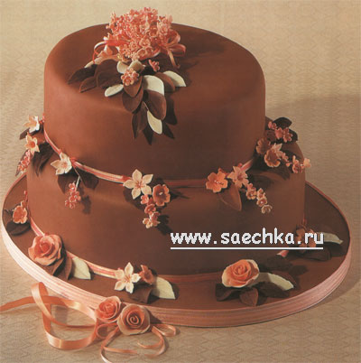Любители шоколада, этот торт создан специально для вас: сочный канарский бисквит, покрытый марципаном и шоколадной сахарной помадкой. Украшение торта - изящные, окрашенные в коралловый цвет сахарные цветы и шоколадные листики, шелковистые ленточки.