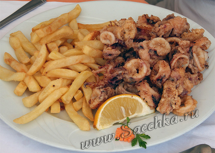 Жареные кальмары приготовлены кольцами - их нужно жарить очень быстро, иначе кальмары станут жёсткими.