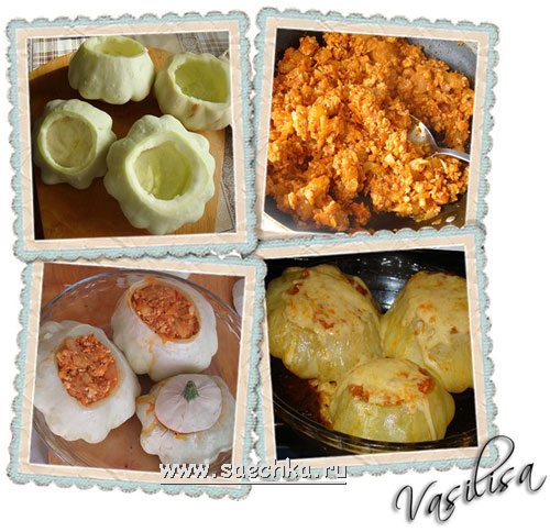 - Этой начинкой нафаршировала отваренные до полуготовности патиссоны, накрыла их крышечками и поставила в духовку запекать.