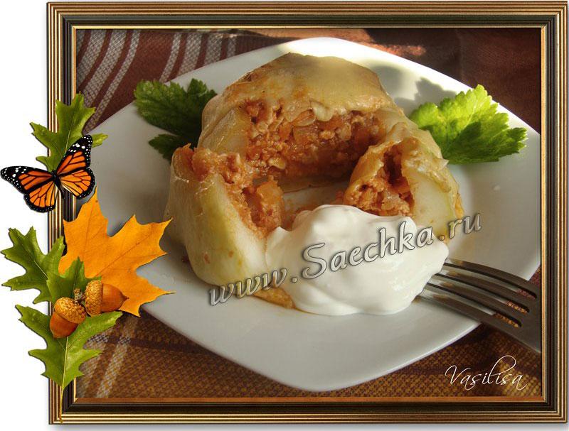 Фаршированные патиссоны приготовлены с фаршем из куриной грудки, подаются на стол со сметаной.