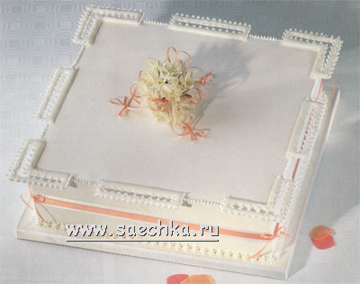 Благодаря четким, строгим линиям этот торт, отделанный королевской глазурью, приобретает поистине царственный вид. Ослепительную белизну торта подчеркивает нежный персиковый цвет декоративной ленточки. В центре помещен изящный букетик живых цветов.