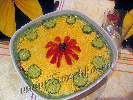 Мне этот слоёный салат из печени трески понравился, нашла рецепт когда-то на просторах инета, но где не записала. Очень сытный. Вкус, правда, на любителя.