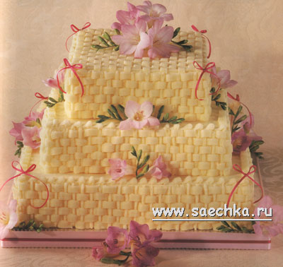 - Прикрепите бантики по углам верхнего и нижнего бисквитов. Разложите цветы у каждой из сторон нижнего и среднего бисквитов, воткните по цветку на углах нижнею бисквита, составьте цветочную композицию наверху. В прохладном месте торт может простоять целый день; если погода жаркая, украсьте его цветами в последний момент.