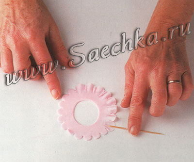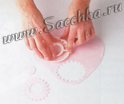 - Раскатайте лепестковую помадку и вырежьте кружок простой или фасонной формочкой диаметром 7,5 см, а середину - простой формочкой диаметром 2,5 см. Можно пользоваться специальной формочкой для вырезания оборок.