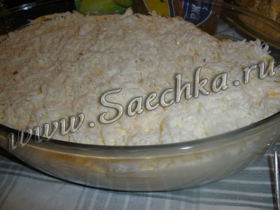 - Курицу и яйца отварить и охладить. Курицу нарезать, яйца разделить на белки и желтки, натереть на мелкой терке.