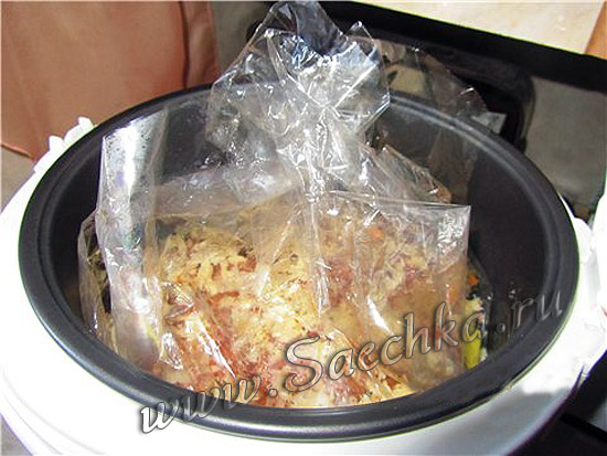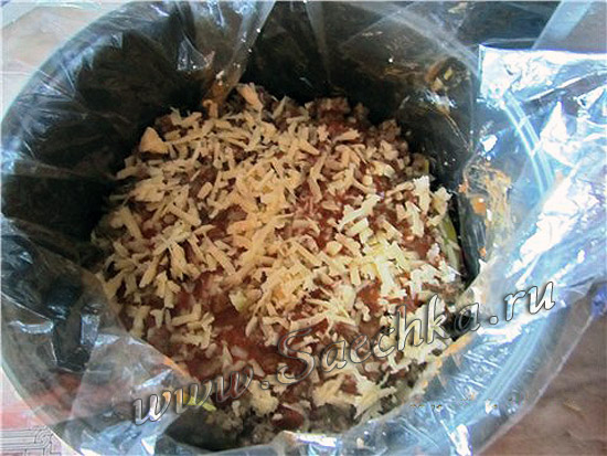 Лазанья приготовлена в мультиварке в рукаве для запекания.