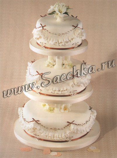 Необычная цветовая гамма - сахарная помадка цвета шампанского и украшения в кофейных тонах - придают торту утонченно элегантный вид, а оборки из сахарной помадки - особое изящество.