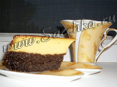 - Готовим следующий (кексовый) слой: 100 г молока обыкновенного, 100 г подсолнечного масла, 1 яйцо, 100 г сахара, 1 ч.л. разрыхлителя, ванилин, 1 стакан муки, 2-4 ч.л. какао. Все указанные ингредиенты взбиваем тоже быстро и... тоже выливаем равномерно в нашу кастрюлю.