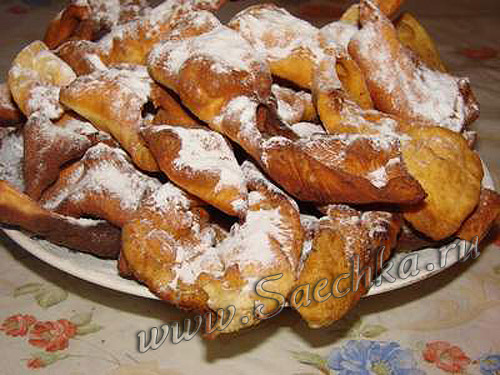 - Готовый хворост охладите и посыпьте сверху сахарной пудрой.