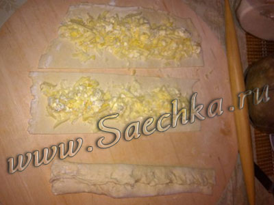 - На каждую полоску выкладываем сыр и зажимаем края: