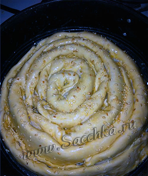 - Укладываем в форму для запекания в виде улитки, смазываем желтком и посыпаем кунжутом:
