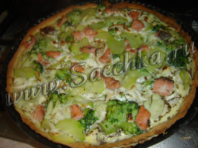 - Запекать в духовке 180 градусов 10 минут, потом убрать горох и выложить начинку (сельдерей, капусту, кабачок, лук-порей, кусочки горбуши).