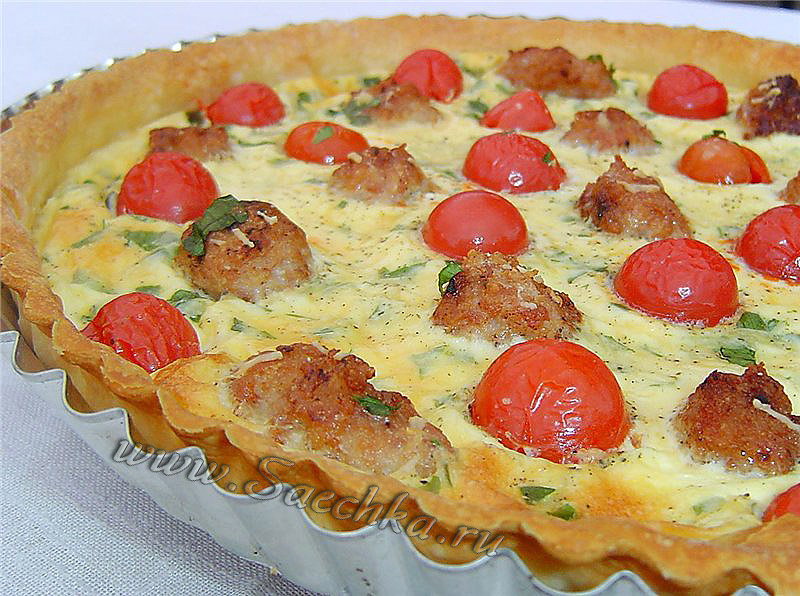 Киш с помидорами и мясными шариками из фарша - это вкусная, сытная еда, которая может послужить полноценным завтраком или ужином.