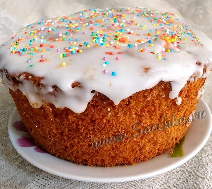 - Готовый кулич пасхальный вынуть, остудить и полить глазурью, посыпать цветной крошкой.