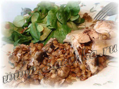 - В тарелку выложить вымытый фельд-салат, чечевично-шпротную смесь и очищенное от кожицы и костей филе ставриды.
