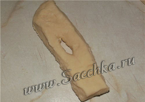 - Теперь формируем пышки. Для этого в середине прямоугольника из теста нужно сделать дырку с помощью ножа: