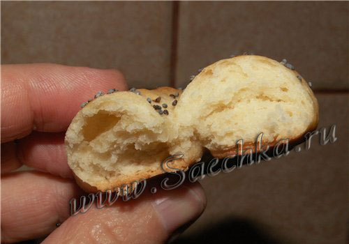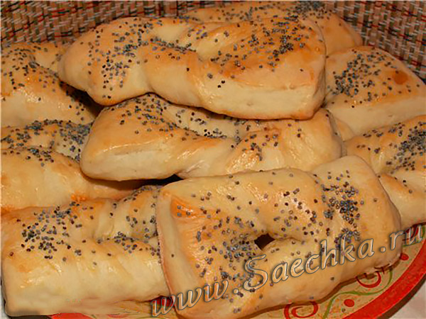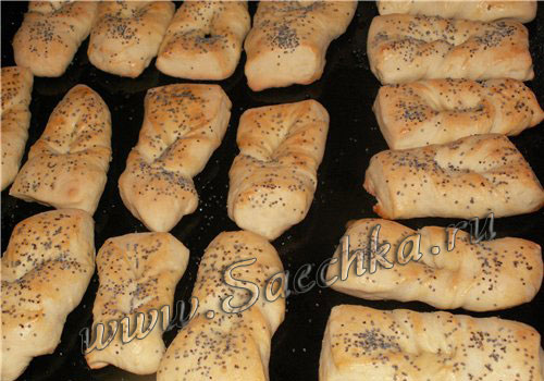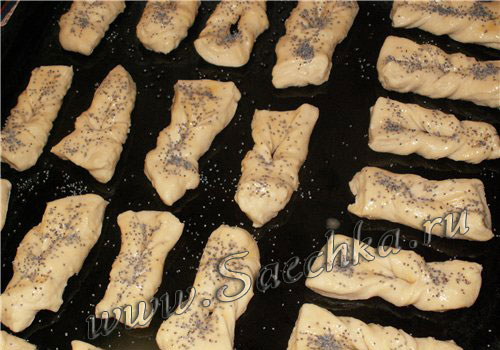 - Противень смазать растительным маслом, выложить изделия, сверху смазать взбитым яйцом и посыпать маком.