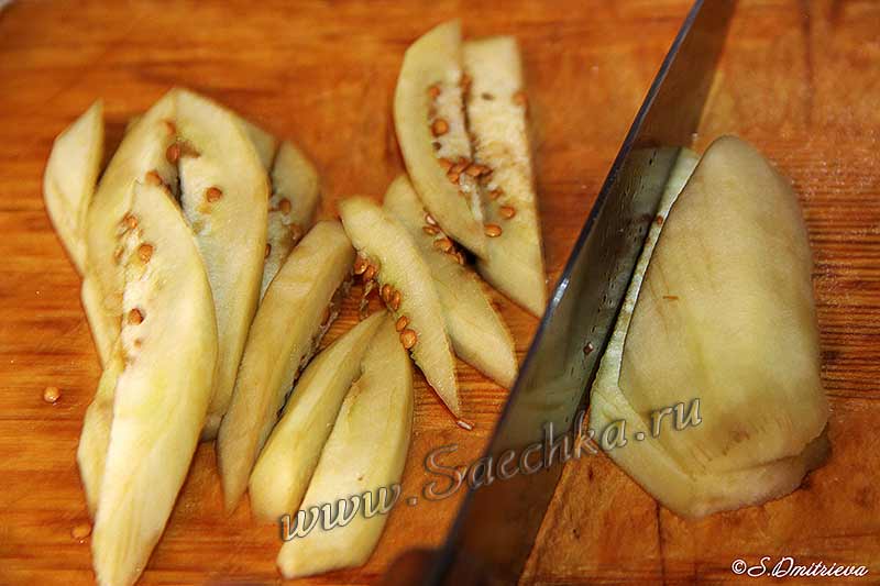 - Чтобы баклажаны не горчили, их просто нужно очистить от шкурки. Очистила баклажаны от шкурки и нарезала их соломкой или брусочками.