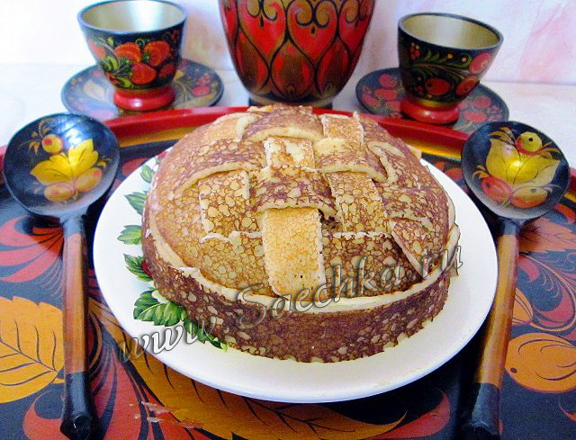 - Из третьего блинчика вырезать подходящие по высоте полоски и обернуть по кругу ими блинный тортик.