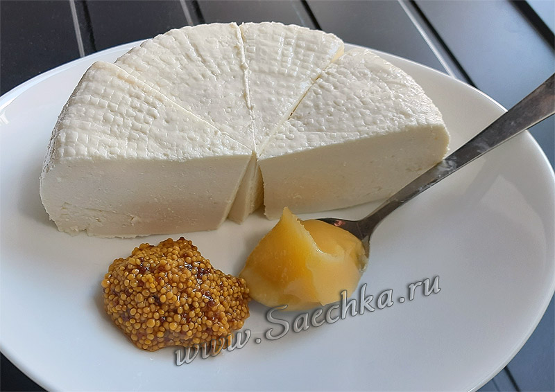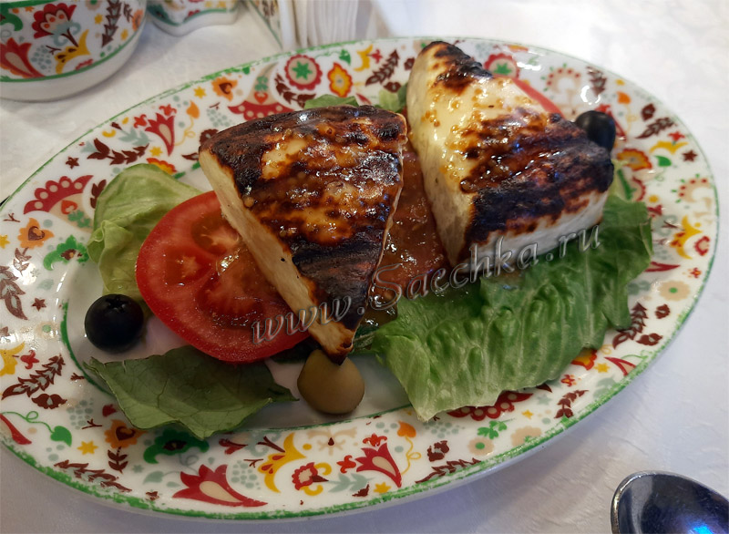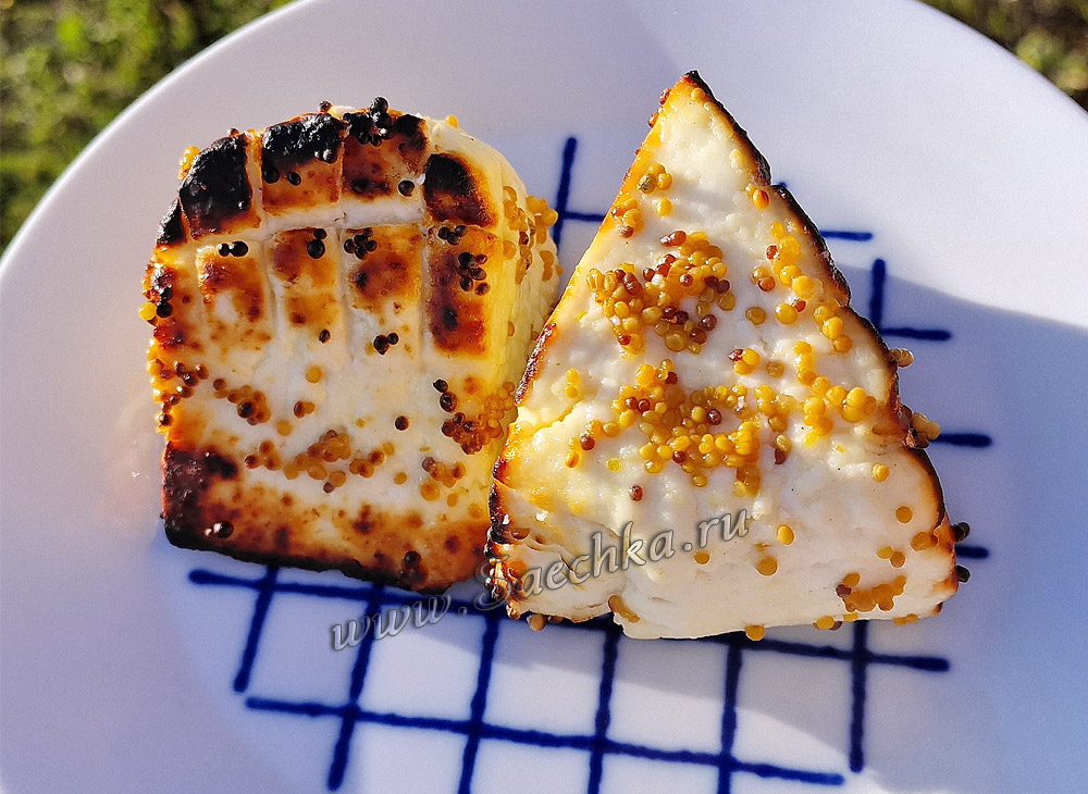 Это жареный на гриле адыгейский сыр, замаринованный в необычном соусе. Готовится крайне просто, а получается необыкновенно вкусно! Но кушать надо горячим, когда остывает - уже не то.