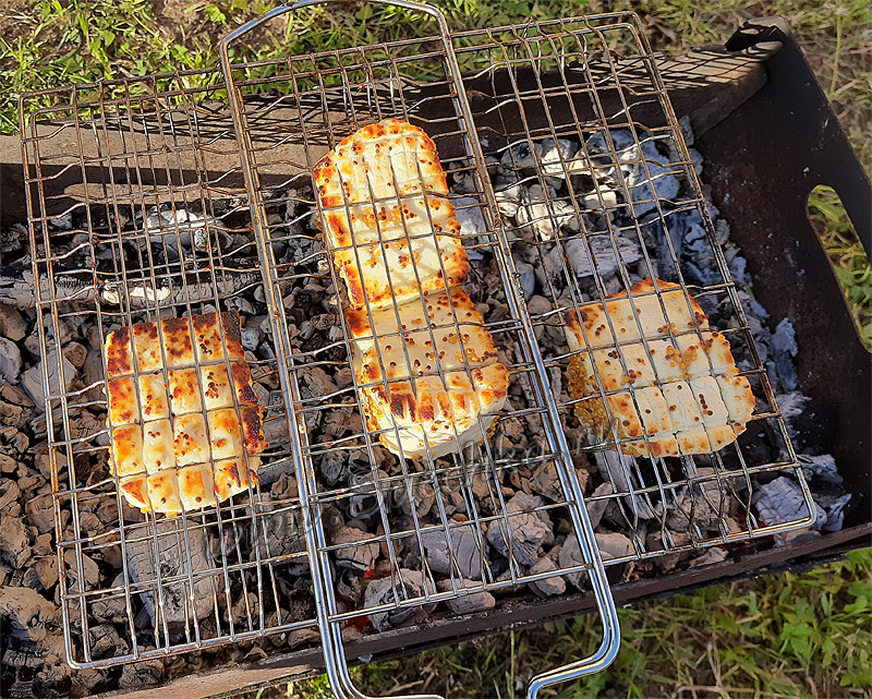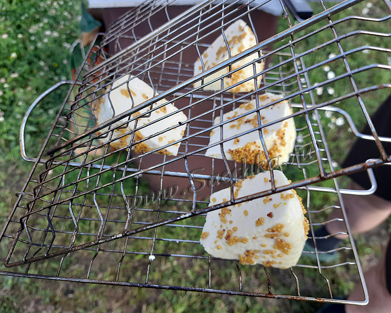 - Жарить адыгейский сыр на гриле на среднем жаре с двух сторон минут 10-12 до румяной корочки.