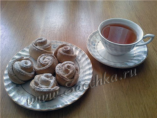 - Скатать их в трубочку и разрезать эту трубочку на 2 части. Получаются 2 булочки в виде розочек.