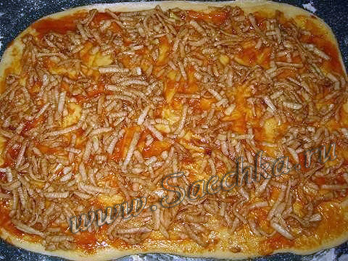 - Раскатать первую половину в прямоугольный пласт, смазать его немного сливочным маслом и вареной сгущенкой. Нанести половину яблочной начинки.