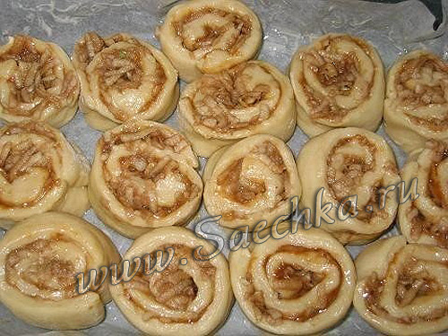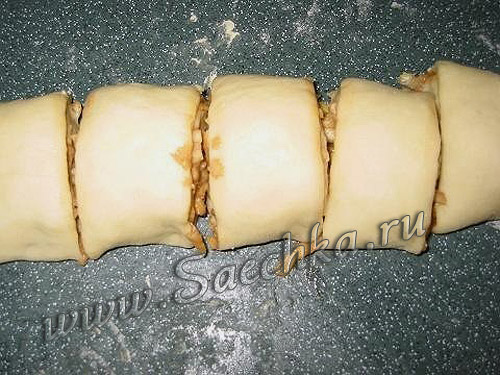 - Свернуть в рулетик и нарезать на кусочки. Так же поступить со второй половинкой теста.