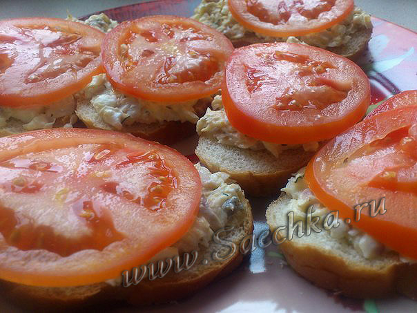 - Намазать полученную бутербродную массу на хлеб, сверху на каждый бутерброд положить тонкий ломтик помидора.