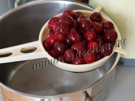 - Т.к. вишня у меня была замороженная, то я ее достала заранее из морозилки и положила в дуршлаг, чтобы стекла лишняя жидкость: