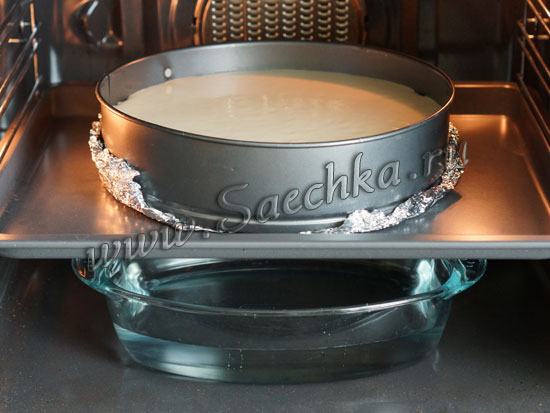 - На дно духовки ставим огнеупорную посуду с водой, сверху ставим чизкейк: