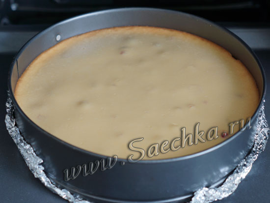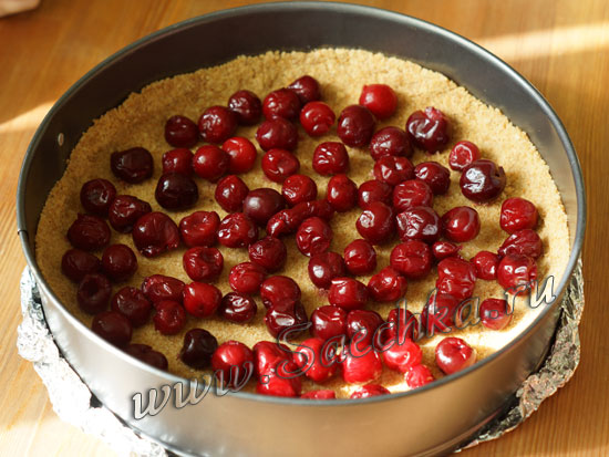 На основу чизкейка выложить вишню: - Сверху аккуратно залить приготовленной начинкой.