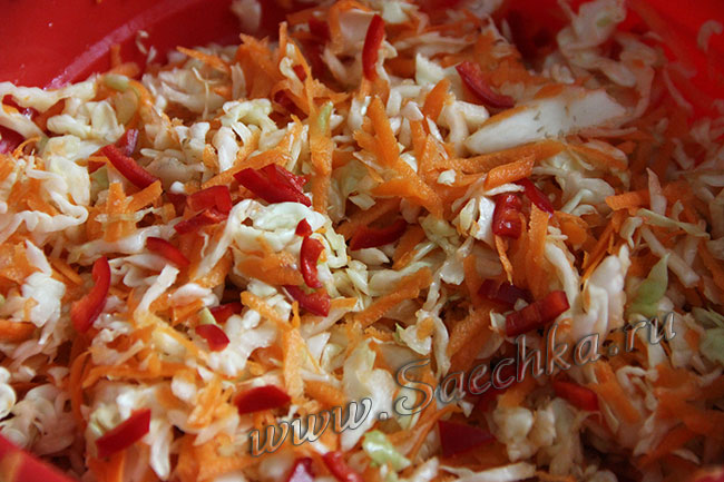- Тонко нашинковать капусту, натереть на крупной тёрке морковь, по желанию нарезать репчатый лук, острый перец, можно добавить и укроп.